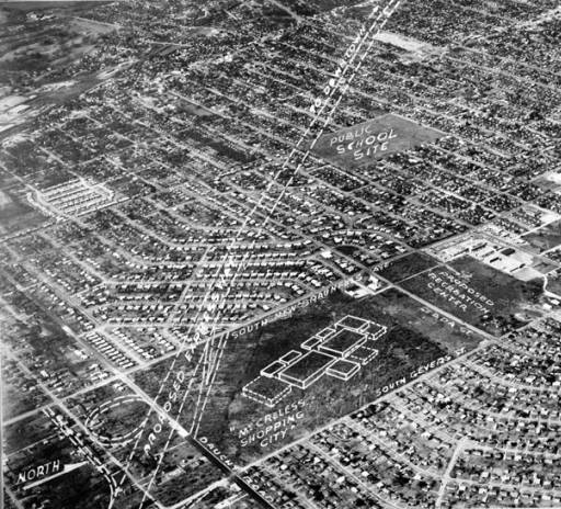 Image shows proposed sites of McCreless Shopping Mall, recreation center, and Expressway (IH-37 / U.S. 281). Z-1536-A-01, Zintgraff Studio Photograph Collection, UTSA Special Collections -- Institute of Texan Cultures