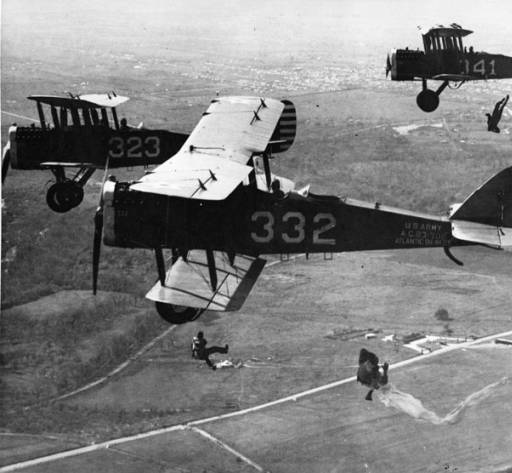Enlisted men jumping from DeHaviland DH-4s during demonstration of the feasibility of using paratroops in battle, near Brooks Field, March 29, 1929. 075-0922, General Photograph Collection, UTSA Special Collections -- ITC.
